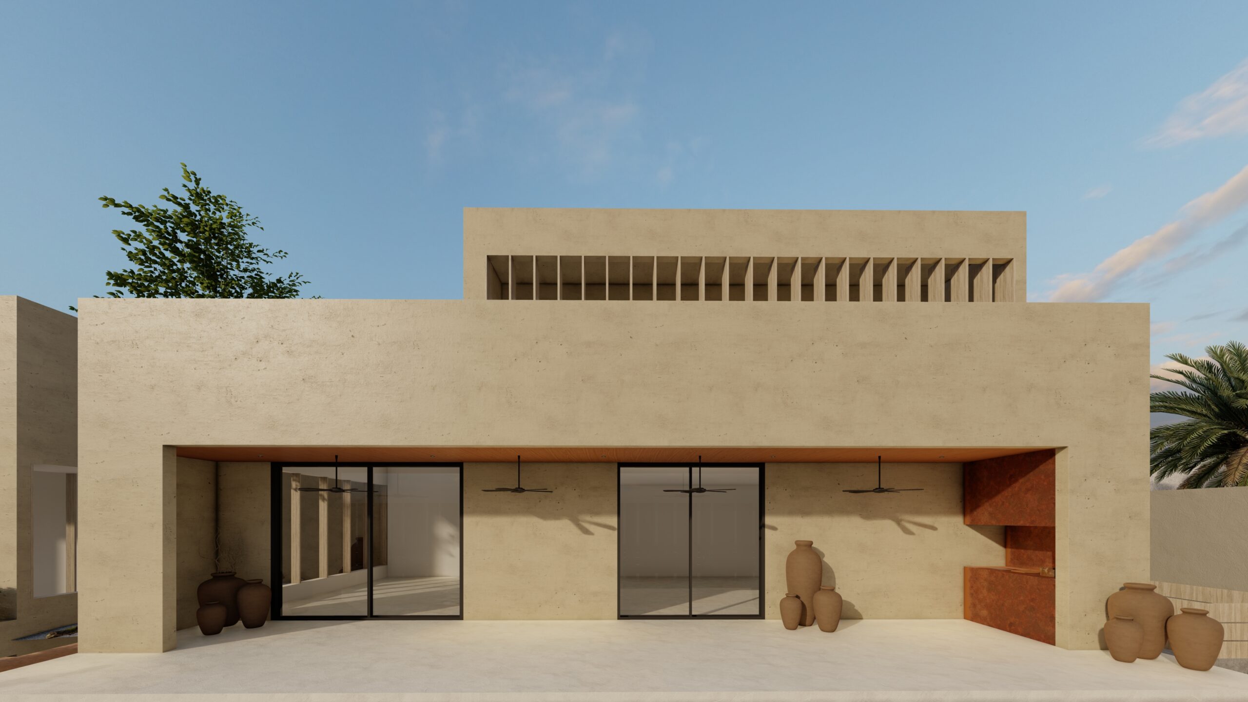 The House with Two Courtyards, features two outdoor space, located at the front and rear of the house. This design is common in traditional and modern homes, as it provides numereous benefits such as privacy, natural lightning, ventilation, and outdoor living areas.