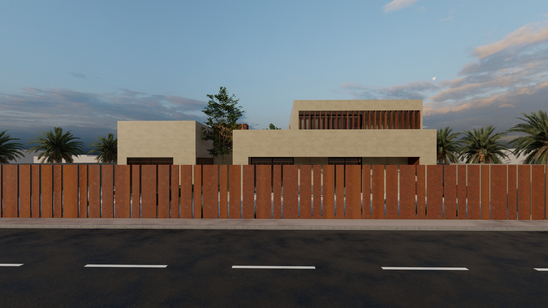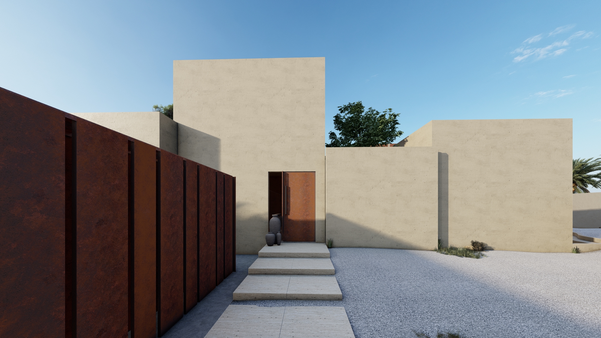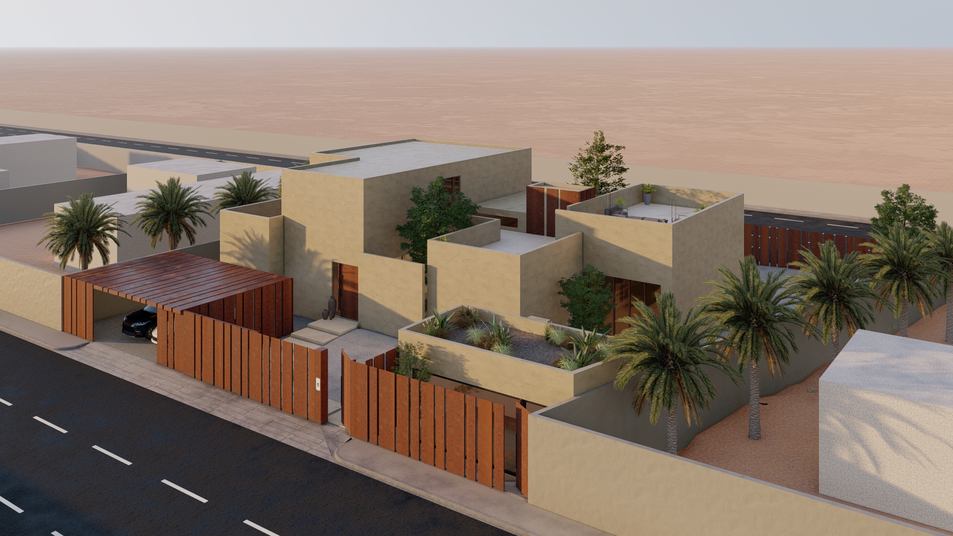 The front courtyard is used as a welcoming area for guests and serves as a buffer zone between the house and the street. It was designed with seating areas, landscaping, and a pathway leading to entrance. The front courtyard is designed for either parking or as a playground for children.